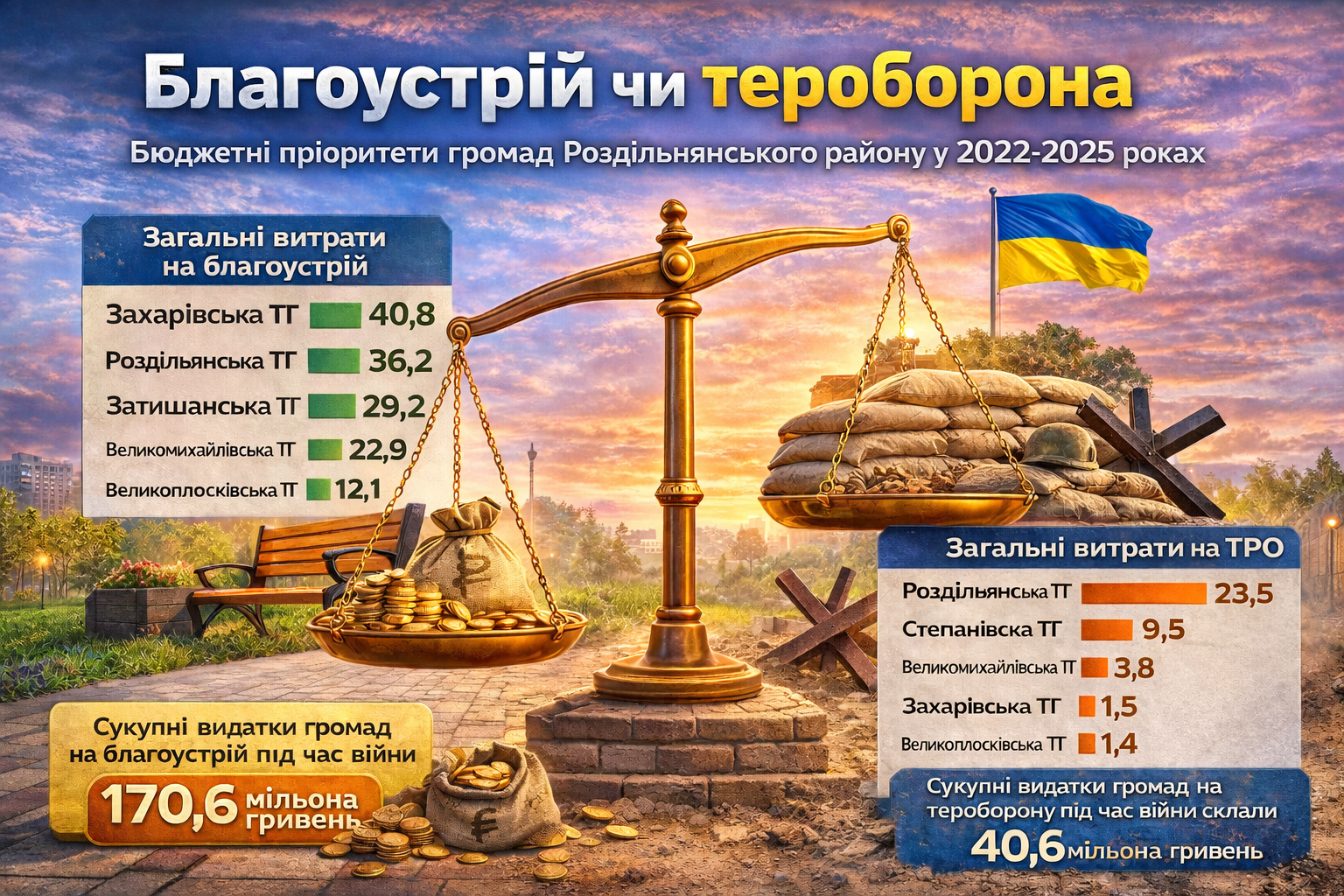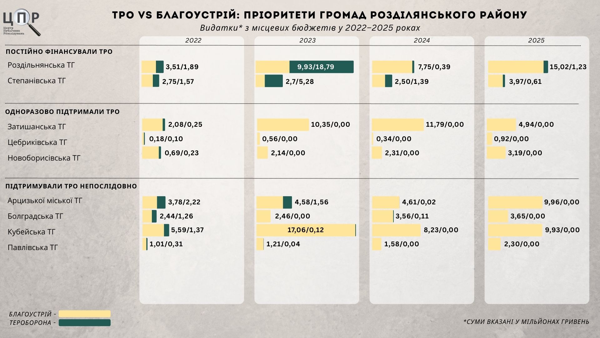 Як бачимо, фінансування заходів територіальної оборони громадами Роздільнянського району у порівнянні з видатками на благоустрій демонструє показову диспропорцію. Сукупно за 2022–2025 роки громади Роздільнянського району витратили 40,6 мільйона гривень на підтримку територіальної оборони й 170,6 мільйона на благоустрій.