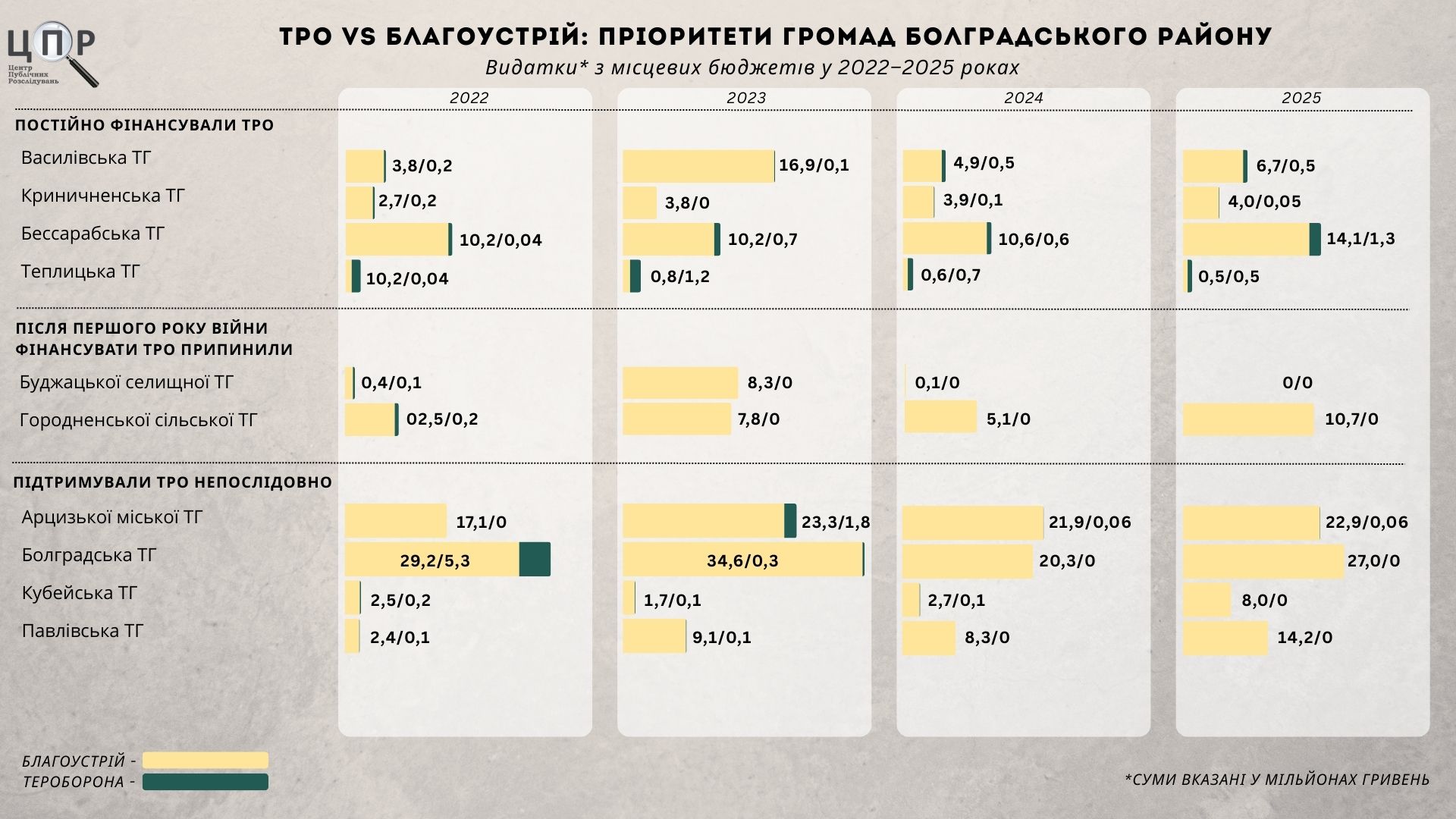Аналіз показує суттєву диспропорцію між фінансуванням територіальної оборони та благоустрою в громадах Болградського району. Сукупно у 2022–2025 роках громади району спрямували на підтримку ТРО 16,4 мільйона гривень, тоді як на благоустрій – 374,8 мільйона гривень.