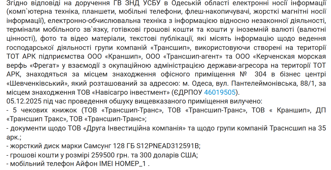 Під час обшуку, який відбувся 5 грудня 2025 року в бізнес-центрі "Шевченківський" на вулиці Пантелеймонівській в Одесі правоохоронці вилучили фінансові документи ТОВ "Навісагро інвестмент", чекові книжки кількох компаній, жорсткий диск, мобільний телефон, а також готівку — майже 260 тисяч гривень і 300 доларів США. За даними СБУ, ці речі можуть містити інформацію про незаконну діяльність і використовуватися як докази у кримінальному провадженні.
