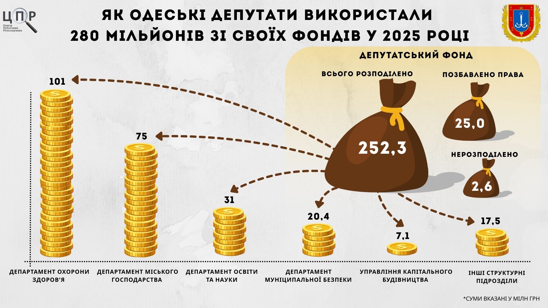 В Одесі діє Положення про депутатський фонд, який входить до бюджету розвитку. Центр публічних розслідувань проаналізував, скільки коштів отримав кожен з депутатів Одеської міськради у 2025 році та які напрями вони профінансували.