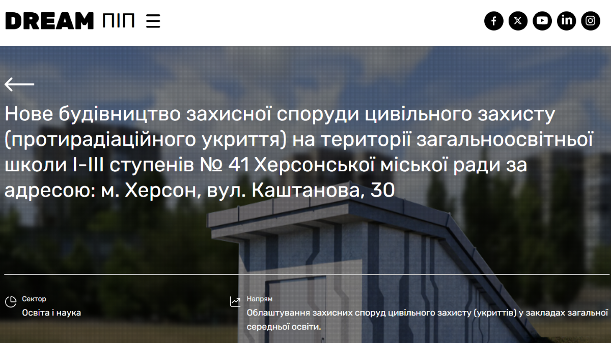 Одним із таких проєктів стало нове будівництво протирадіаційного укриття на території загальноосвітньої школи І–ІІІ ступенів №41 Херсонської міської ради. Заплановано, що площа укриття по плану становитиме 1298,17 квадратного метра. Простір поділять на кілька функціональних зон: навчальну, спортивну, відпочинкову, господарську та інші.