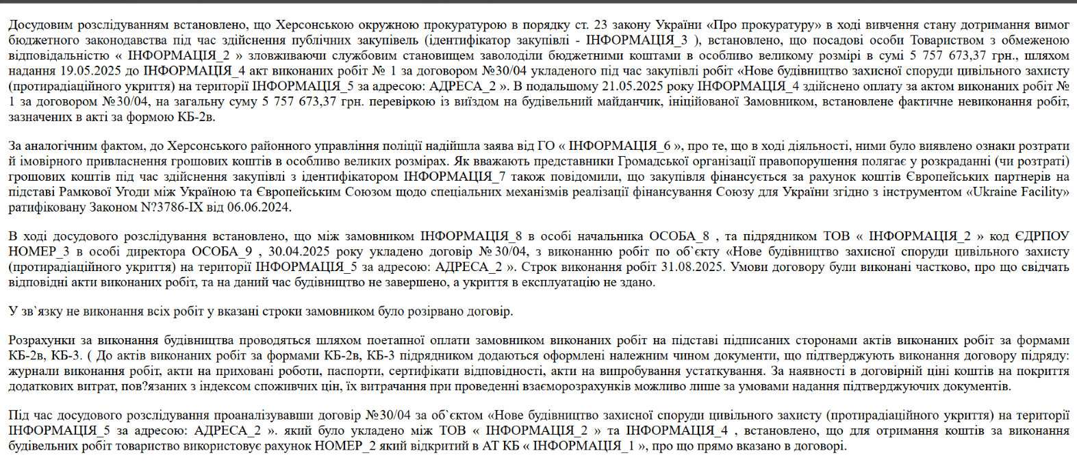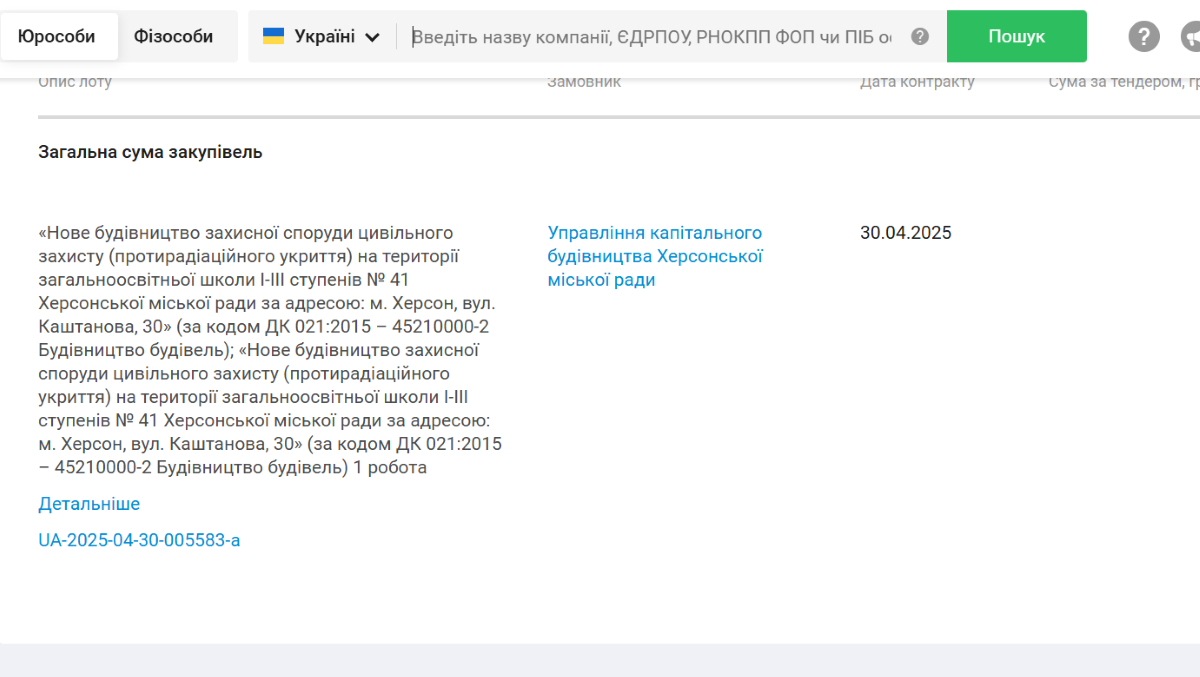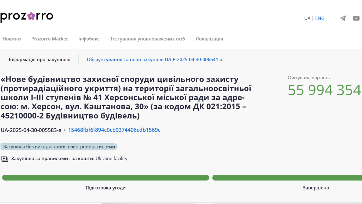 За даними системи публічних закупівель Prozorro, у квітні 2025 року Управління капітального будівництва Херсонської міської ради уклало договір із ТОВ "Мегаплан Фаст". За умовами контракту компанія мала збудувати протирадіаційне укриття на території школи №41 та завершити роботи до 31 серпня 2025 року.
