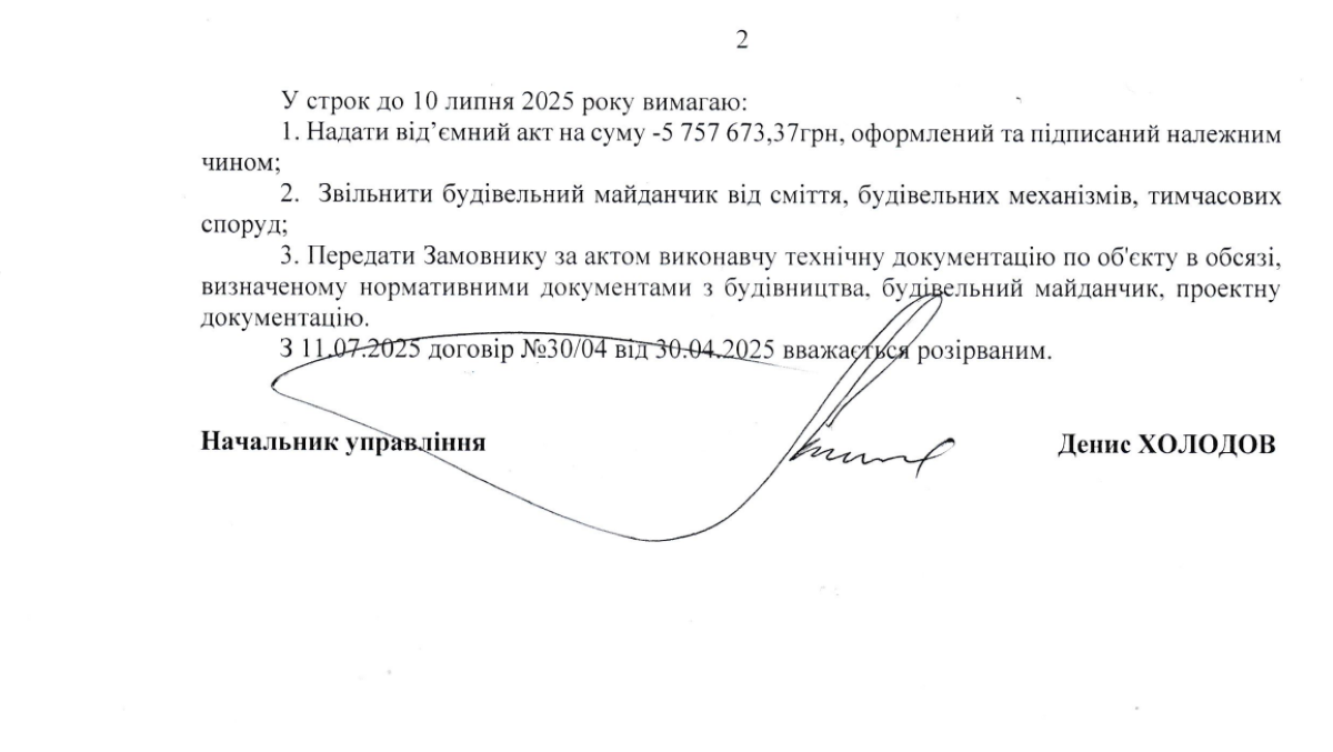 У липні 2025 року з товариством договір розірвали. У документі зазначили, що підрядник подав акт виконаних робіт на суму 5,7 мільйона гривень, який був завізований представником технічного нагляду. Однак під час перевірки із виїздом на будівельний майданчик замовник встановив, що роботи, вказані в акті, фактично не виконані.