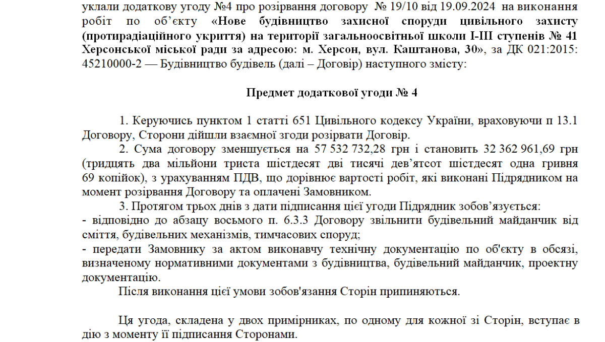 Згідно з пунктом 7.3 договору, якщо підрядник не розпочинає роботи вчасно або виконує їх настільки повільно, що завершення у визначений термін стає неможливим, замовник має право відмовитися від договору. Після розірвання контракту його суму зменшили на 55,9 мільйона, і вона становила 0 гривень.