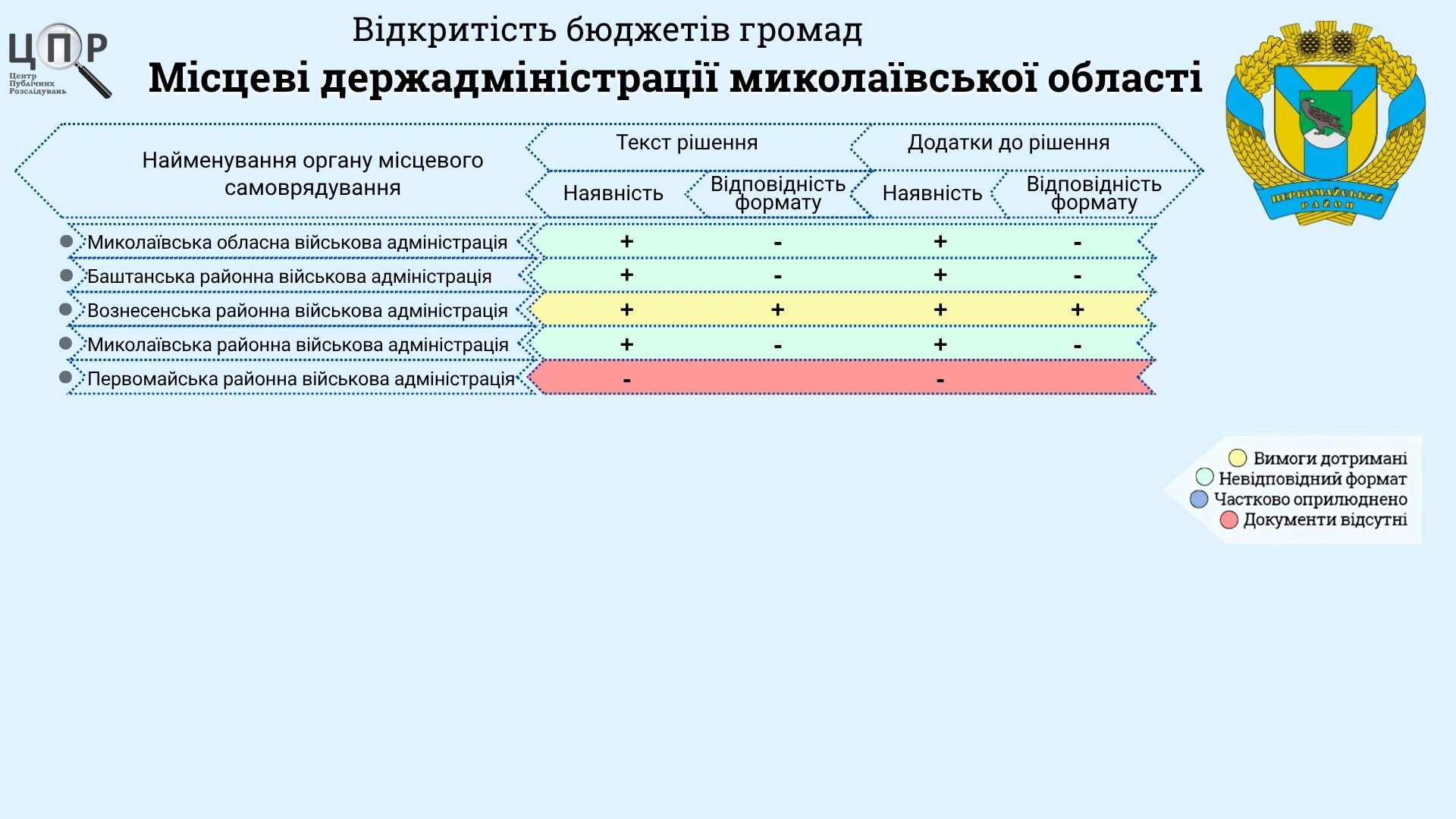Проведений огляд показав, що з п’яти адміністрацій Миколаївщини лише одна — Вознесенська — повністю виконує вимоги законодавства, оприлюднюючи документи у належних форматах. На сайтах трьох адміністрацій (обласної, Баштанської та Миколаївської) розпорядження опубліковані, але у форматах, не передбачених чинним законом. А на сайті Первомайської адміністрації потрібного рішення не виявлено зовсім.