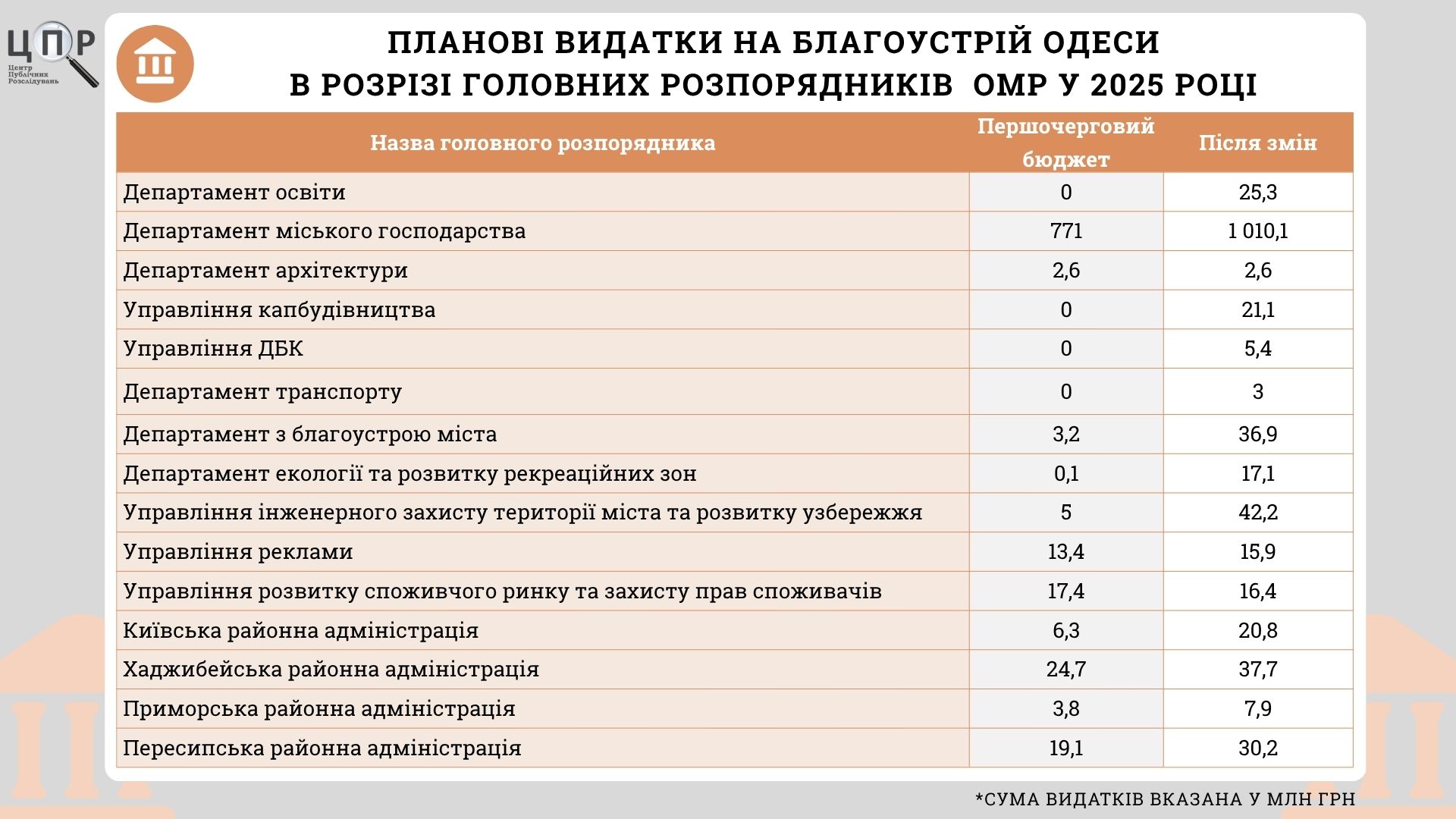 Згідно з паспортом бюджетної програми, департамент з благоустрою міста ОМР передбачив кілька напрямів витрат. Найбільший з них – 25 мільйонів гривень на визначення технічного стану об’єктів нерухомого майна: нежитлових та житлових об’єктів цільової програми "Незламна Одеса". У самій програмі суми значно більші, ніж у рішенні про місцевий бюджет, що пояснюється неможливістю заздалегідь спрогнозувати кількість і масштаби пошкоджених будівель – фінансування коригується залежно від фактичної потреби.