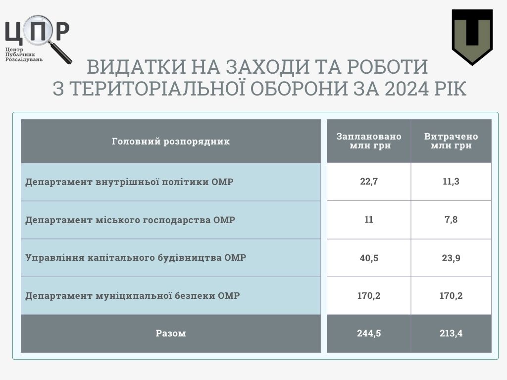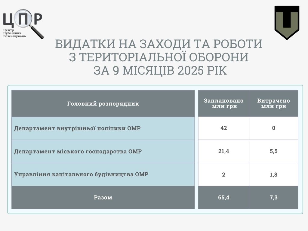 Якщо поглянути детальніше, видно, що фактичні витрати стосувалися лише невеликих ремонтів будівель "для потреб територіальної оборони" та видатків департаменту міського господарства — на ремонт автомобільної техніки військових частин. Більше жодних витрат за цим напрямом Казначейство за дев’ять місяців 2025 року не зафіксувало.