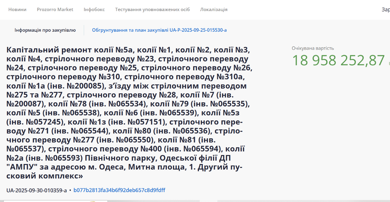 Наприкінці вересня Одеська філія ДП "Адміністрація морських портів України" оголосила тендер на капітальний ремонт колій і стрілочного переводу Північного парку на Митній площі. На ці роботи запланували майже 19 мільйонів гривень. Подання пропозицій тривало до 21 жовтня, але аукціон не відбувся — свою пропозицію подала лише одна компанія, постійний підрядник АМПУ — ТОВ "Метпроект". Згідно з тендерною документацією, роботи мають завершити до 31 грудня 2026 року, передбачена післяоплата.
