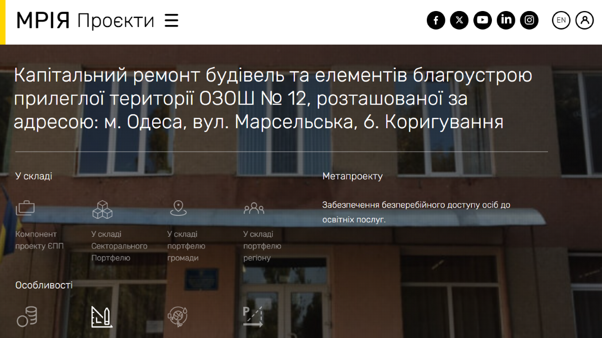 В Одесі ініціювали капітальний ремонт Одеської загальноосвітньої школи №12 на вулиці Марсельській, 6. Проєкт уже має затверджену проєктно-кошторисну документацію та перебуває в активному статусі.