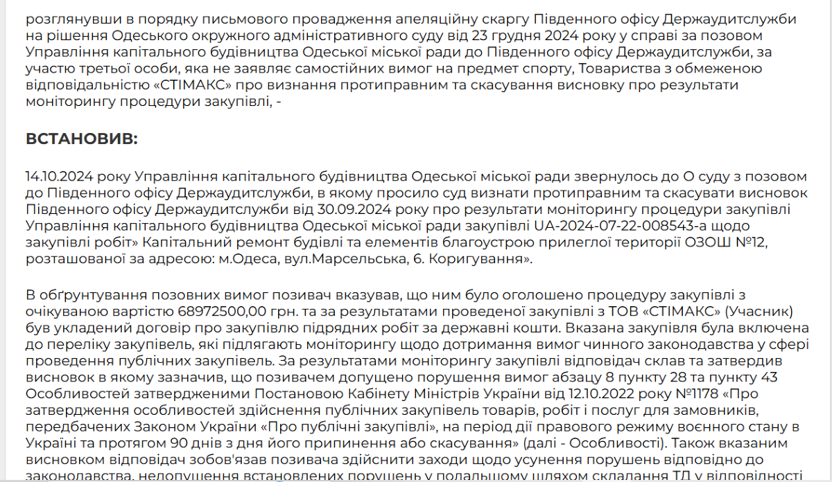 Йдеться про справу за позовом Управління капітального будівництва Одеської міської ради до Південного офісу Держаудитслужби. Третьою стороною у процесі виступає ТОВ "Стімакс", яке не заявило самостійних вимог. Позов стосувався вимоги визнати незаконним та скасувати висновок аудиторів за результатами моніторингу процедури закупівлі.