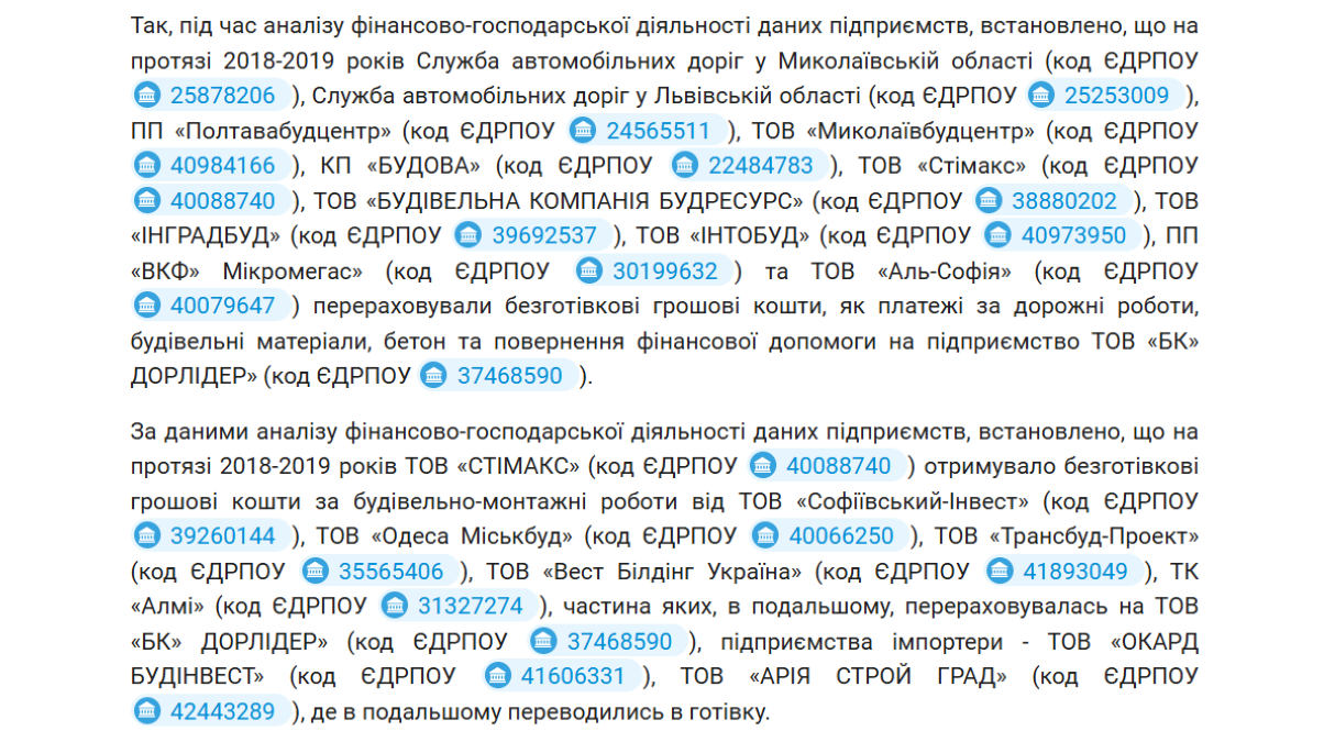 Під час перевірки фінансово-господарської діяльності цих компаній з'ясували, що у 2018–2019 роках Служба автомобільних доріг Миколаївської та Львівської областей, а також низка приватних компаній — ТОВ "Стімакс", в тому числі — перераховували безготівкові кошти як оплату за дорожні роботи, будівельні матеріали, бетон або як повернення фінансової допомоги на рахунок ТОВ "БК Дорлідер".