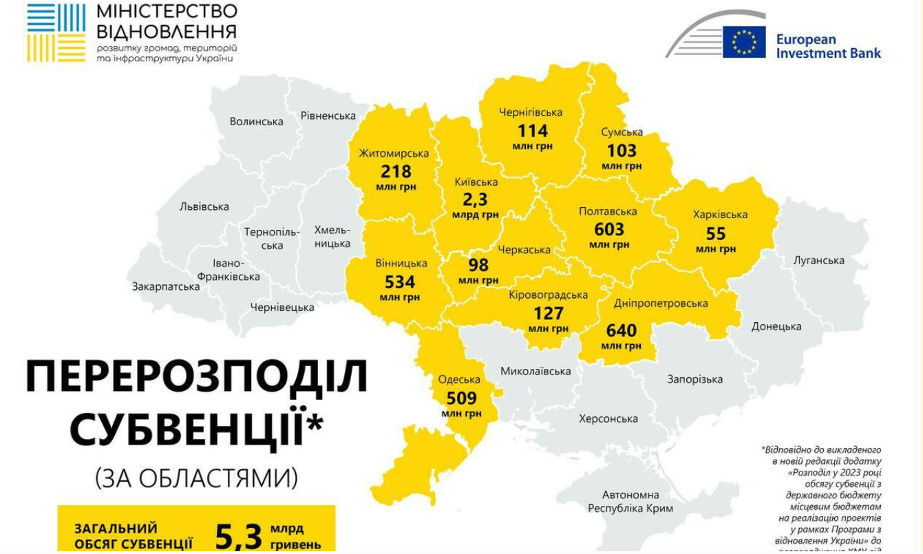 У 2023 році Кабінет Міністрів України затвердив перерозподіл субвенції з державного місцевим бюджетам для можливості реалізації додаткових 33 регіональних проєктів відновлення. Відповідні зміни були внесені в урядове розпорядження № 596-р від 4 липня 2023 р. за ініціативи Міністерства розвитку громад, територій та інфраструктури України.