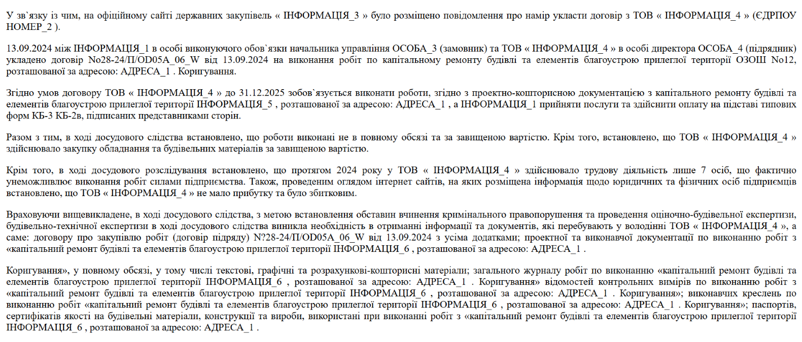 Як зазначили слідчі у своєму клопотанні, під час досудового розслідування, щоб з’ясувати всі обставини правопорушення та провести необхідні будівельні експертизи, виникла потреба отримати інформацію і документи, які знаходяться у володінні компанії.