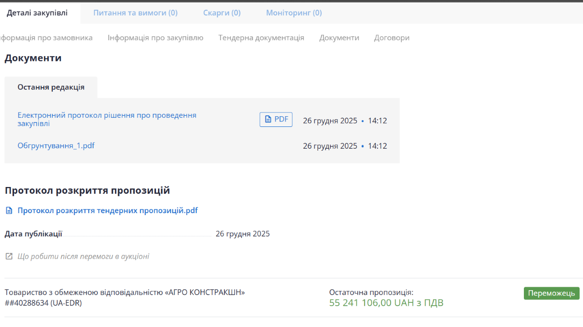 Переможцем тендеру стало ТОВ "Агро Констракшн", яке запропонувало виконати роботи за 55 241 106 гривень із ПДВ. Договір укладено 26 грудня 2025 року, а завершити реконструкцію планують до 31 грудня 2026 року.