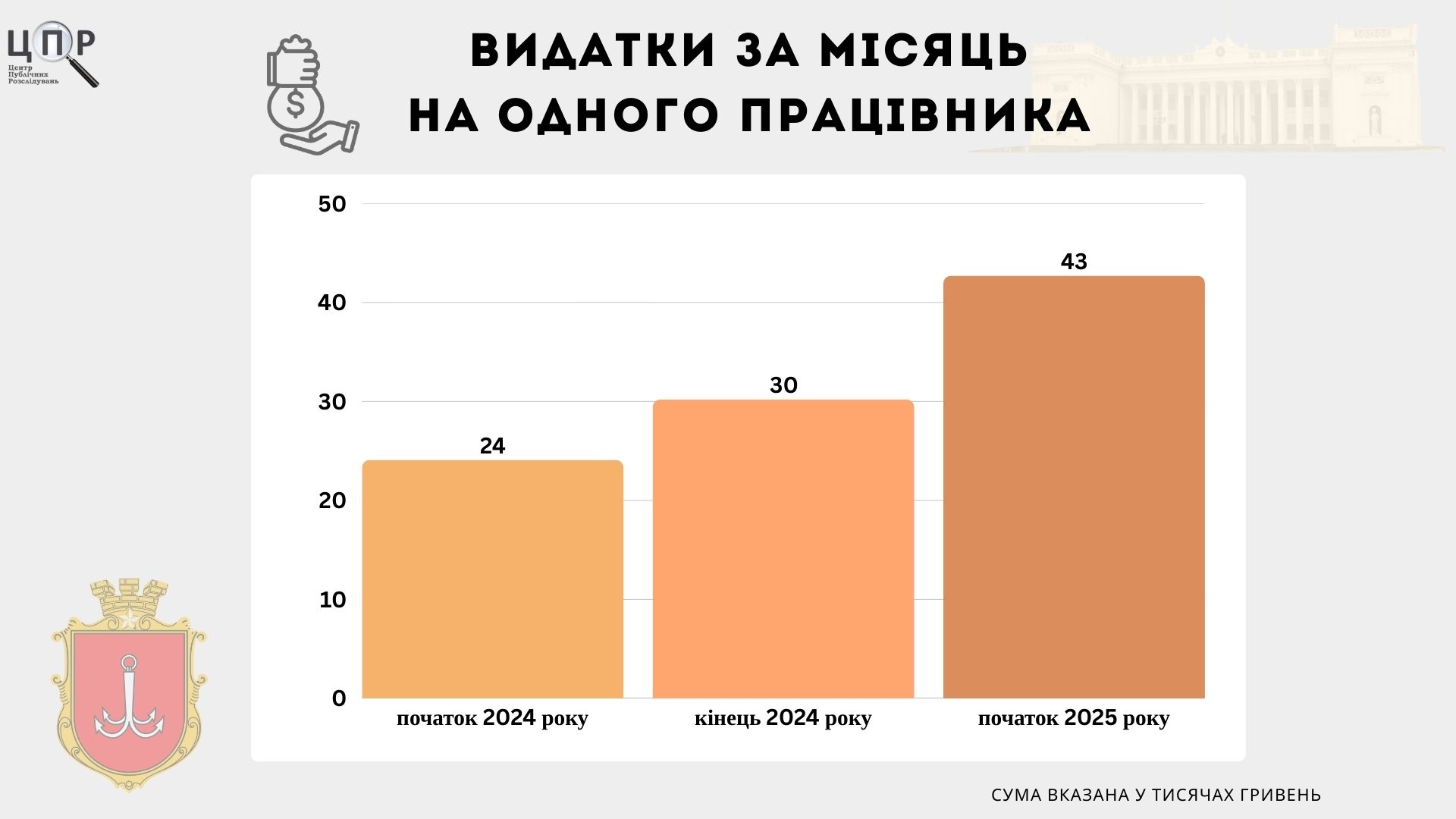 Оцінюючи стан справ у сфері оплати праці в виконавчих органах Одеської міської ради, ЦПР встановив що в її основі є мовчання, суперечливі рішення та вибіркове трактування норм. При цьому середня сума на місяць на одну штатну одиницю заздалегідь встановлена на рівні вдвічі більше, ніж середня по регіону.