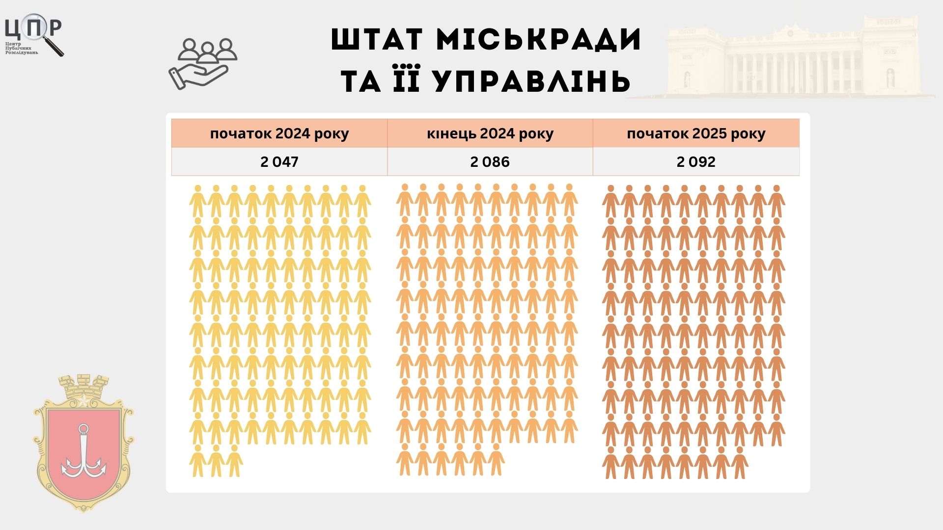 Гранична штатна чисельність виконавчих органів Одеської міської ради регулюються рішенням Одеської міської ради «Про затвердження структури виконавчих органів, загальної чисельності апарату Одеської міської ради та її виконавчих органів», у яке постійно вносяться зміни. До недавнього часу у штаті ОМР було 2100 людей, а з квітня 2025 – вже 2300. Але це не все.