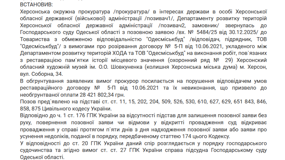 За ухвалою Господарського суду в Одеській області, Херсонська окружна прокуратура від імені держави в особі Херсонської ОВА та Департаменту розвитку територій ХОДА звернулася до суду і з позовом до ТОВ "Одесміськбуд". Йдеться про розірвання договору від 10 червня 2021 року на реставрацію Херсонського обласного художнього музею імені Олексія Шовкуненка.