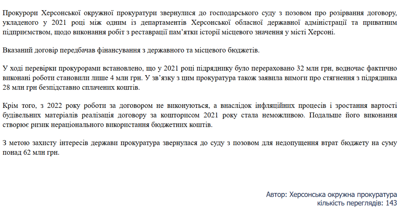 Прокурори стверджують, що компанія порушила умови договору і не виконала роботи в повному обсязі. Через це з державного бюджету було необґрунтовано виплачено понад 28 мільйонів гривень.
