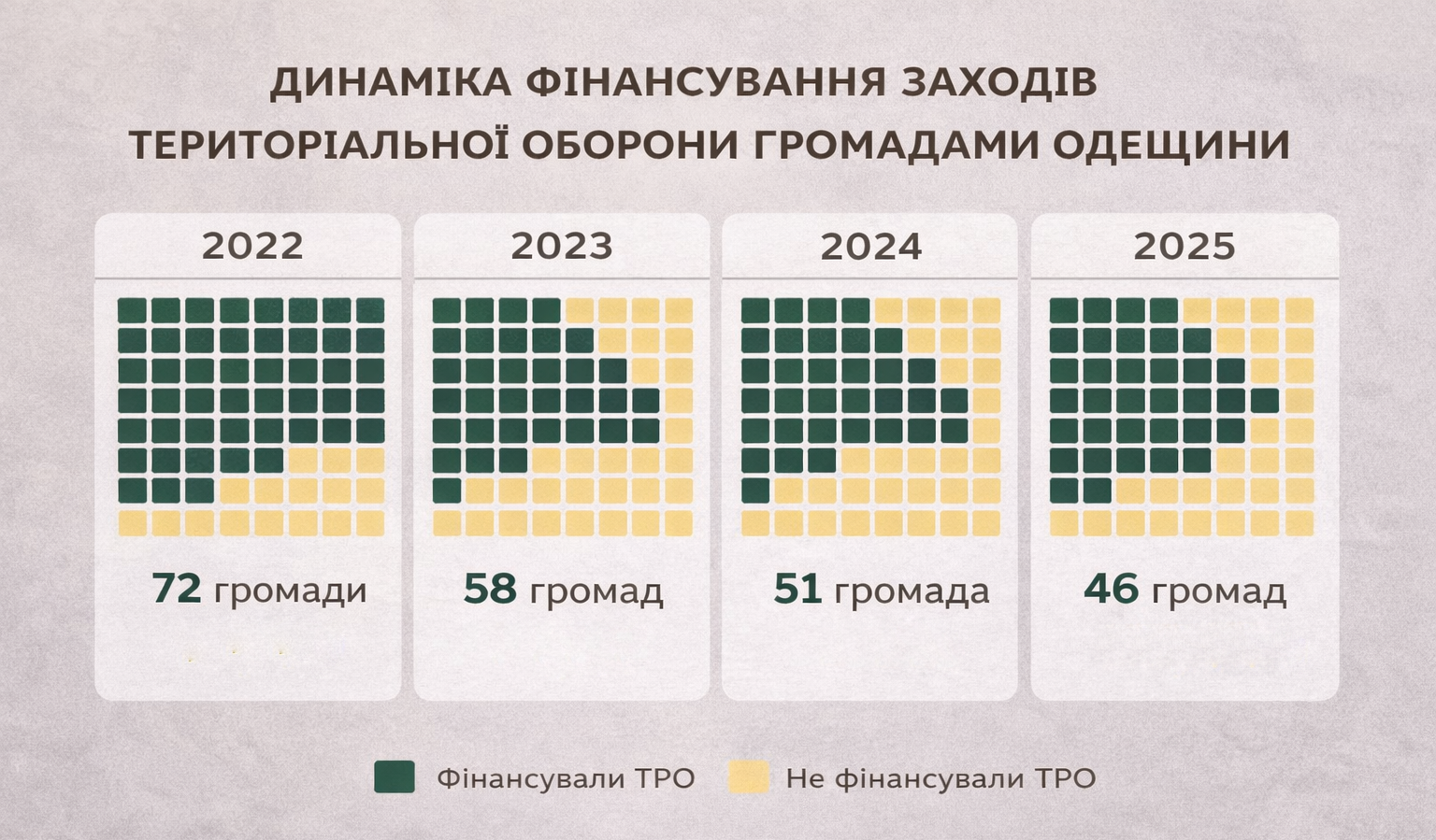 В серії аналитик щодо фінансування заходів територіальної оборони громадами Одеської області, Центр публічних розслідувань, показав чи залишається підтримка ТРО стабільною, чи з часом поступово зменшується. Виявилось, що протягом 2022–2025 років кількість громад, які виділяли кошти на територіальну оборону, поступово скорочувалася. Якщо у перший рік повномасштабної війни такі видатки здійснювали більшість громад області, то згодом їхня частка зменшувалася.