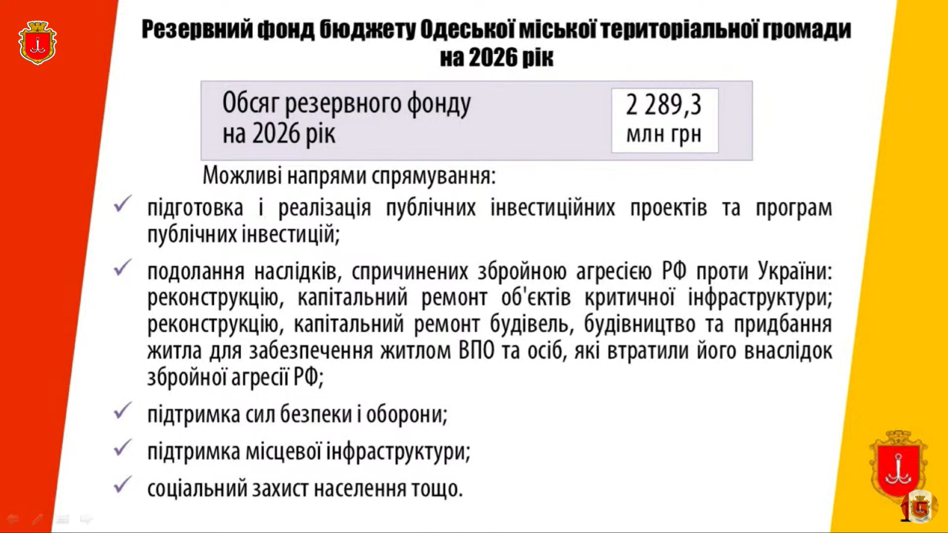 Слайд про напрями використання резервного фонду створив враження, що його готували без урахування вимог Бюджетного кодексу. Резервний фонд призначений лише для непередбачених видатків, які не могли бути враховані під час складання бюджету. Натомість у презентації зазначено, що його планують спрямовувати на публічні інвестиційні проєкти, які мають бути включені до проєкту бюджету заздалегідь.