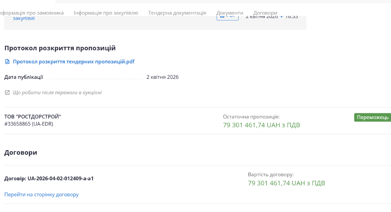 Підрядником визначили ТОВ "Ростдорстрой", яке запропонувало виконати роботи за повну очікувану вартість. Закупівля проведена за неконкурентною процедурою відповідно до постанови Кабміну №1178, яка регулює публічні закупівлі в умовах воєнного стану. Замовник обґрунтував таке рішення нагальною потребою — обставинами, що не дозволяють дотриматися строків для проведення відкритих торгів або використання електронного каталогу.