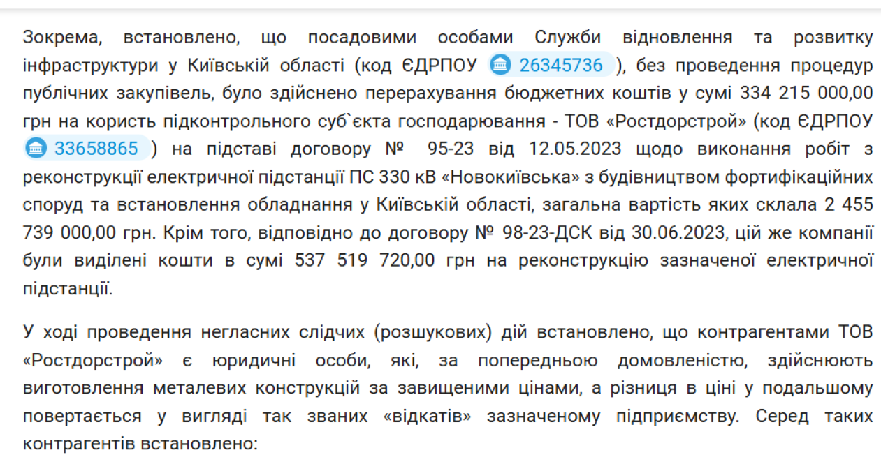 Правоохоронці встановили, що посадовці Служби відновлення та розвитку інфраструктури у Київській області без проведення відкритих тендерів перерахували понад 334 мільйони гривень компанії "Ростдорстрой". Кошти пішли на роботи з реконструкції підстанції "Новокиївська" та будівництво фортифікацій. Загальна вартість цього проєкту становила понад 2,4 мільярда. Крім того, за іншим договором цій же фірмі додатково виділили ще понад 537 мільйонів гривень на ті ж роботи.