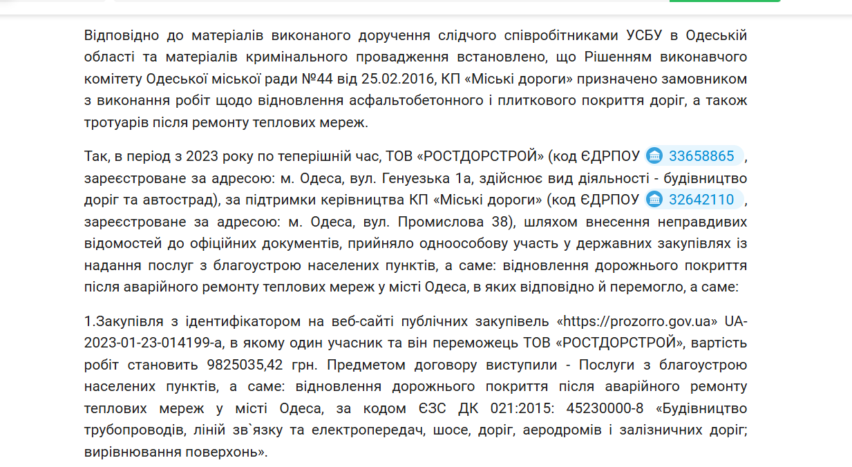Також, за ухвалою Київського районного суду Одеси від 14 листопада 2025 року, з 2023 року і донині компанія "Ростдорстрой" разом із керівництвом КП "Міські дороги", ймовірно, вносили неправдиві дані до документів. Підприємство фактично без конкуренції брало участь у держзакупівлях на роботи з благоустрою — зокрема відновлення доріг після ремонту тепломереж в Одесі — і в усіх випадках перемагало. Загальна сума цих закупівель перевищила 209,7 мільйона гривень.