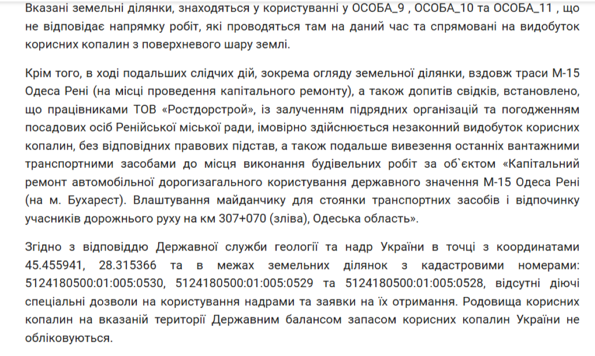 Під час слідства — після огляду ділянки вздовж цієї дороги та допитів свідків — з’явилися підозри, що працівники компанії разом із підрядниками, ймовірно, незаконно видобували корисні копалини без жодних дозволів. За версією слідства, їх вантажили у транспорт і використовували для будівельних робіт на цій же трасі. При цьому такі дії могли відбуватися за погодженням окремих посадовців Ренійської міськради.