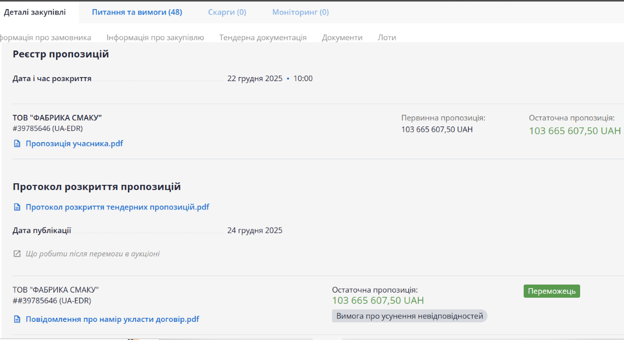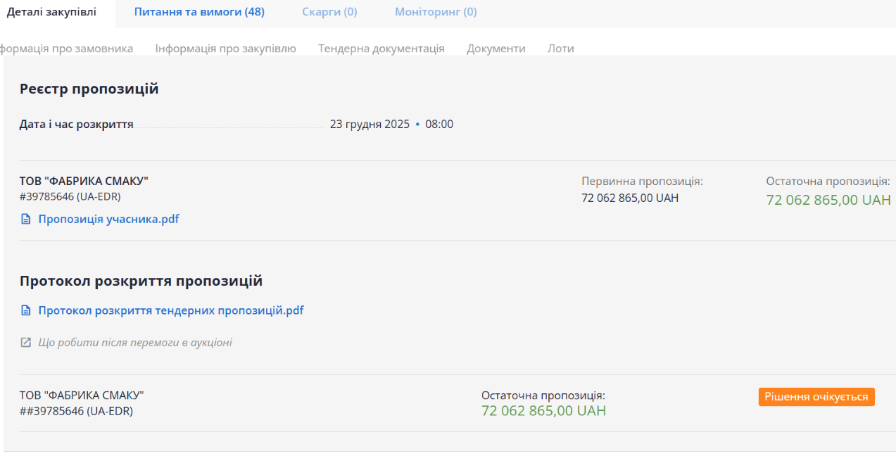 На тендери у Приморському та Пересипському районах загальною сумою понад 175 мільйонів гривень подала пропозицію лише одна компанія — ТОВ "Фабрика смаку".