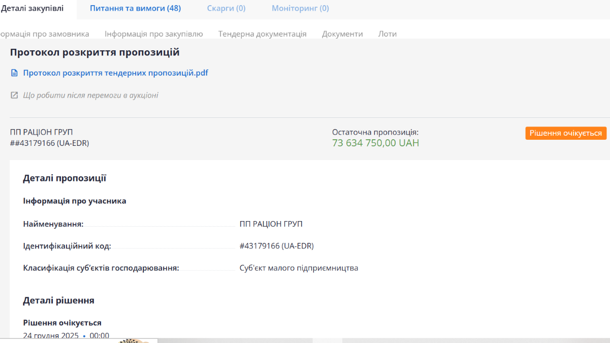 Щодо іншого підрядника, за даними аналітичного сервісу YouControl, ПП "Раціон Груп" було зареєстроване у 2019 році зі статутним капіталом понад 89 тисяч гривень. Власником та директором приватного підприємства є Максим Яценко. Репутація компанії у медіа також неоднозначна. З дня заснування підприємство заробило на державних тендерах понад 391 мільйон гривень. Одним із постійних замовників компанії є КУ "Центр фінансування та господарської діяльності закладів та установ системи освіти Київського району м. Одеси".