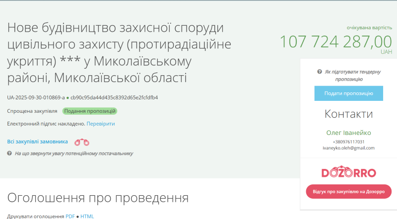 У Миколаївському районі Миколаївської області планують збудувати нову захисну споруду цивільного захисту — протирадіаційне укриття. Замовником робіт виступає військова частина Т0310, а очікувана вартість будівництва становить понад 107 мільйонів гривень.