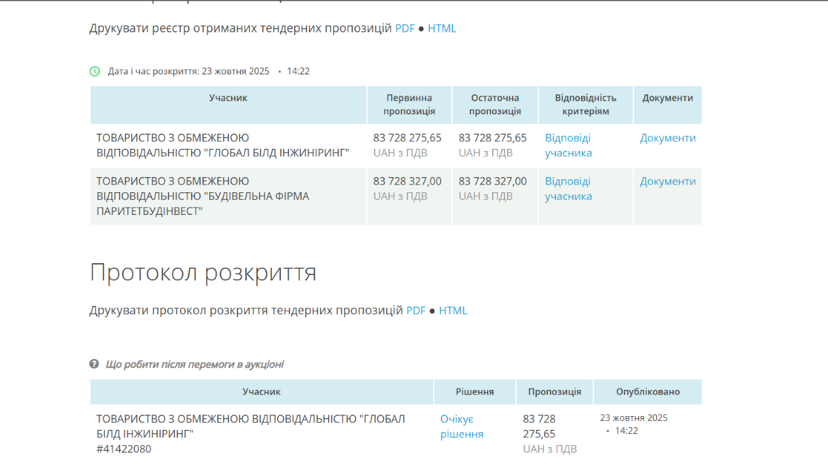 Електронний аукціон стартував 23 жовтня. Участь у ньому взяли дві компанії — "Будівельна фірма Паритетбудінвест" та "Глобал Білд Інжиніринг". Перемогу здобула остання, запропонувавши нижчу ціну. Наразі фірма очікує на рішення про підписання контракту.
