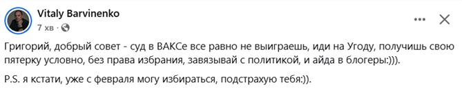 "Григорію, добра порада - суд у ВАКС все одно не виграєш, йди на угоду, отримаєш свою п'ятірку умовно без права обрання, зав'язуй із політикою, і айда в блогери", - жартома написав він.