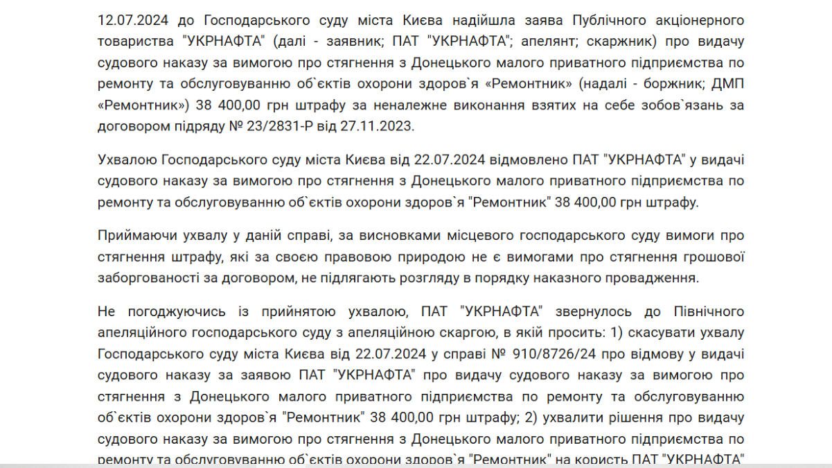 Ще в липні 2024 року "Укрнафта" звернулась до Господарського суду Києва, щоб отримати судовий наказ і стягнути 38 400 грн штрафу. Ці гроші компанія вимагала через те, що ПП "Ремонтник" 1993" порушило строки виконання робіт за договором.