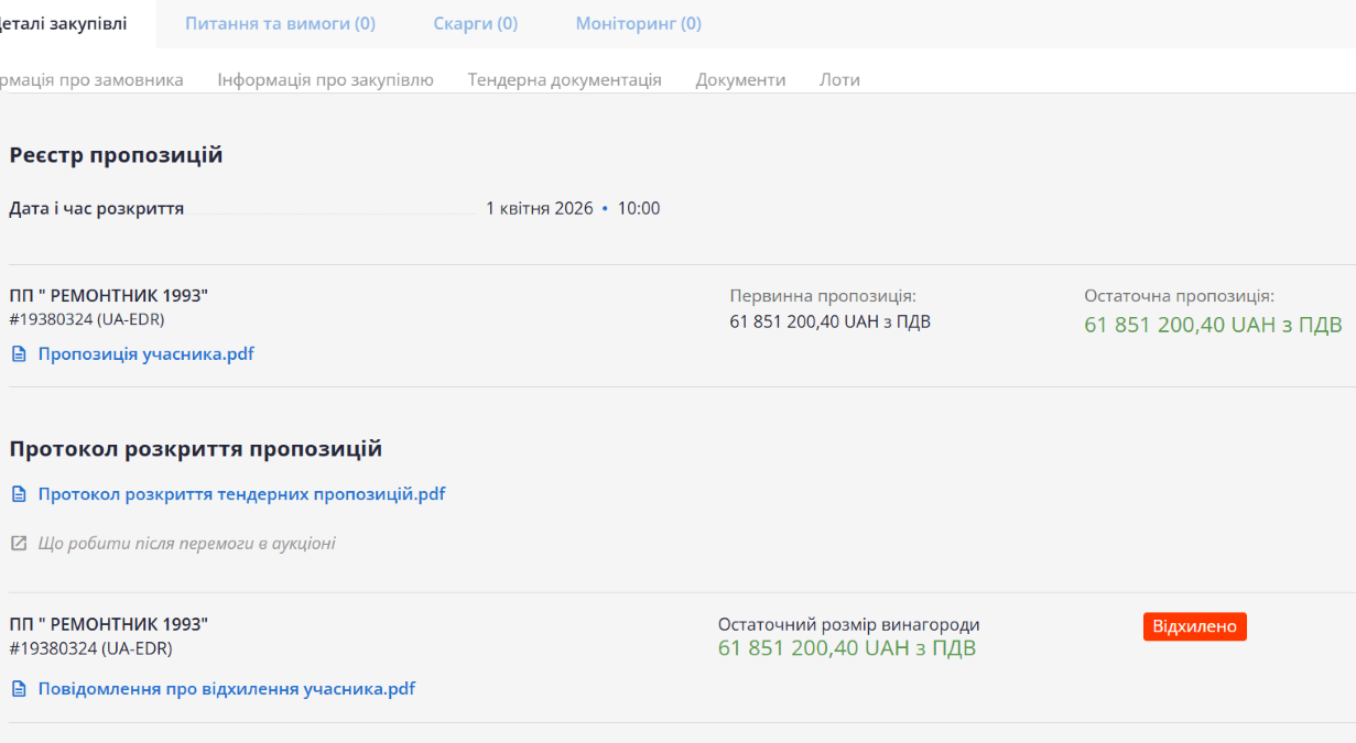 Єдиним учасником стало приватне підприємство "Ремонтник 1993", яке подало пропозицію, що повністю відповідає очікуваній вартості. Зниження ціни не відбулося.