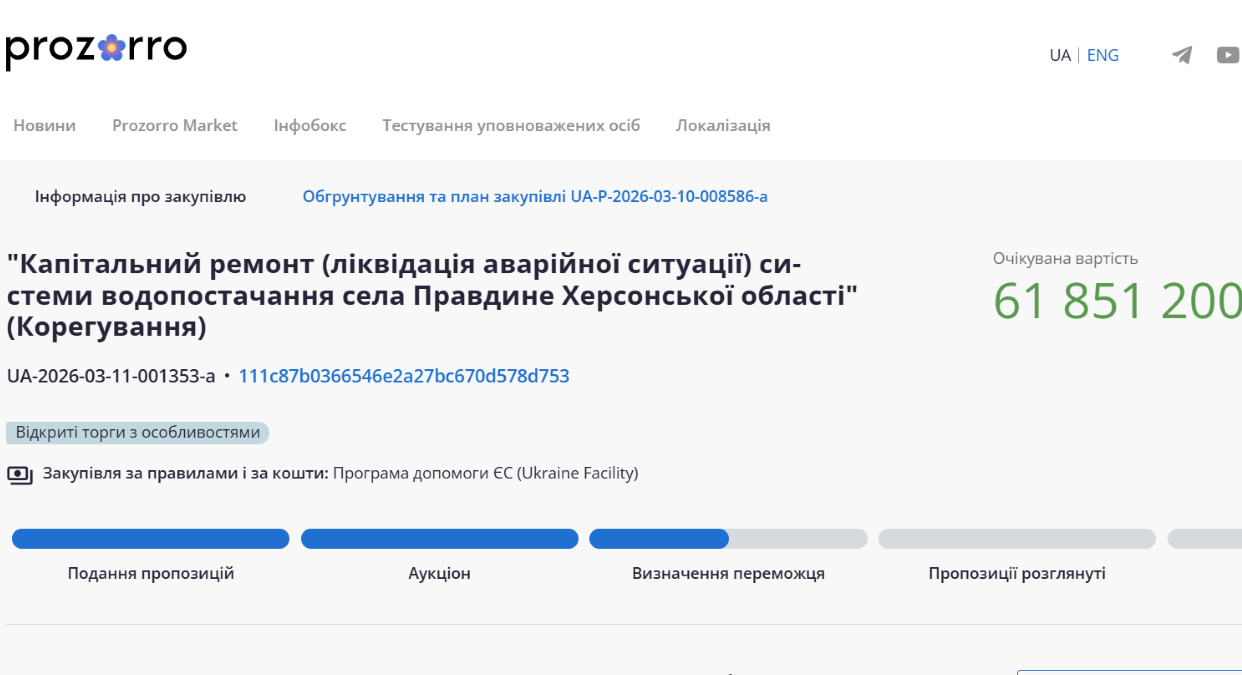 За даними системи публічних закупівель Prozorro, у Херсонській області планували витратити понад 61 мільйон гривень на ремонт водопостачання у прифронтовому селі Правдине. Відповідний тендер уже відбувся, однак участь у ньому взяв лише один учасник.