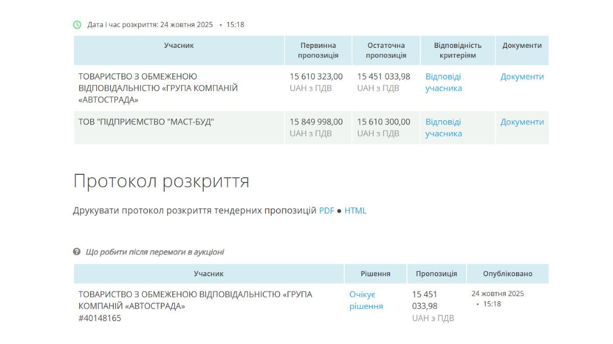 У торгах взяли участь дві компанії — "Підприємство “Маст-Буд” та "Група компаній “Автострада”. Остання наразі очікує рішення про підписання договору. Компанія входить до фінансово-промислової групи MS Capital, кінцевим бенефіціаром якої є бізнесмен Максим Шкіль.