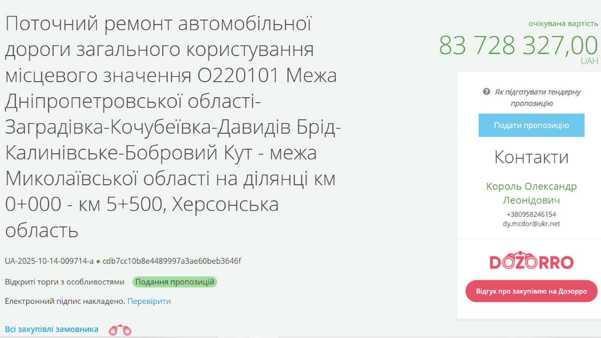 Державна установа "Місцеві дороги Херсонщини" оголосила відкриті торги на поточний ремонт автомобільної дороги загального користування місцевого значення, яка проходить через Бериславський район Херсонської області.