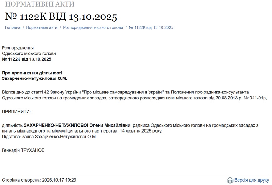 Тим часом розпорядження про припинення її повноважень як радниці оприлюднене 17 жовтня, але підписане 13 жовтня, а свою роботу вона припинила з 14 жовтня.