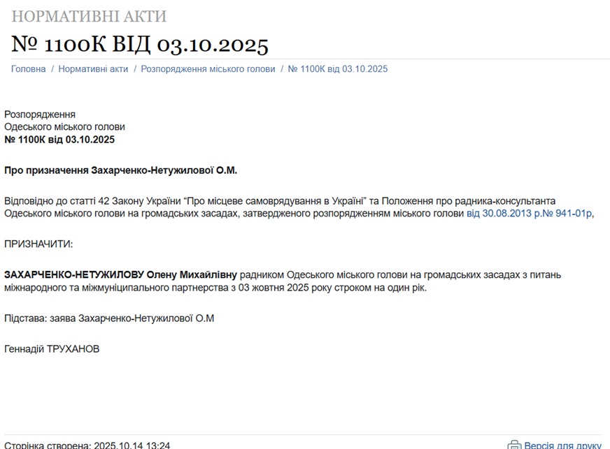 Зазначимо, що нова радниця була призначена 3 жовтня, але розпорядження оприлюднили 14 жовтня.