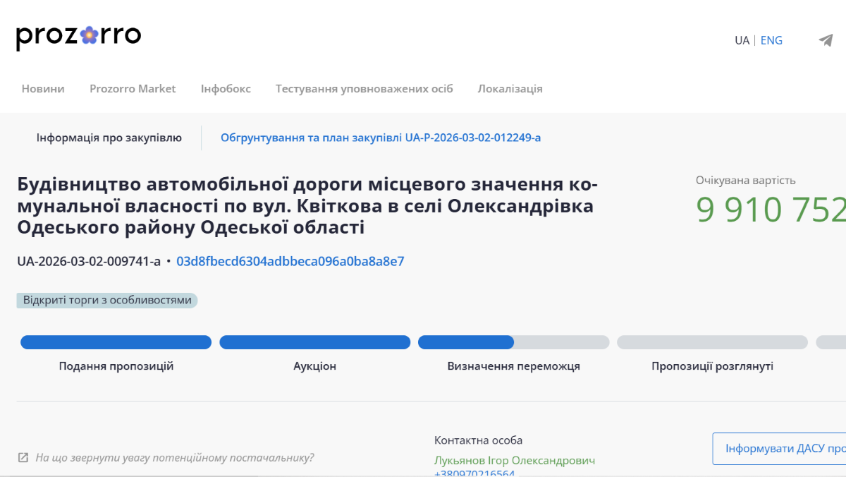 Так, за даними системи публічних закупівель Prozorro, будівництво автомобільної дороги по вулиці Квітковій у селі Олександрівка Одеського району, яке фінансується з місцевого бюджету Фонтанської громади, фактично пройшло без конкурентної боротьби. Закупівлю з очікуваною вартістю 9 910 752 гривні оголосило 2 березня 2026 року Управління капітального будівництва Фонтанської сільської ради.