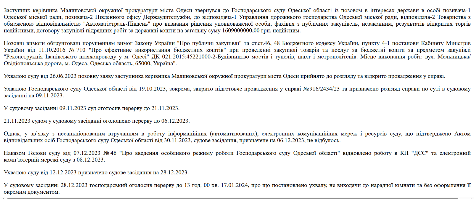 Компанія також фігурує у низці кримінальних проваджень. У січні 2024 року Малиновська окружна прокуратура подала позов щодо тендеру на реконструкцію Іванівського шляхопроводу в Одесі вартістю 1,609 мільярда гривень, який виграла саме "Автомагістраль-Південь". Прокуратура вимагала визнати результати торгів і договір недійсними.