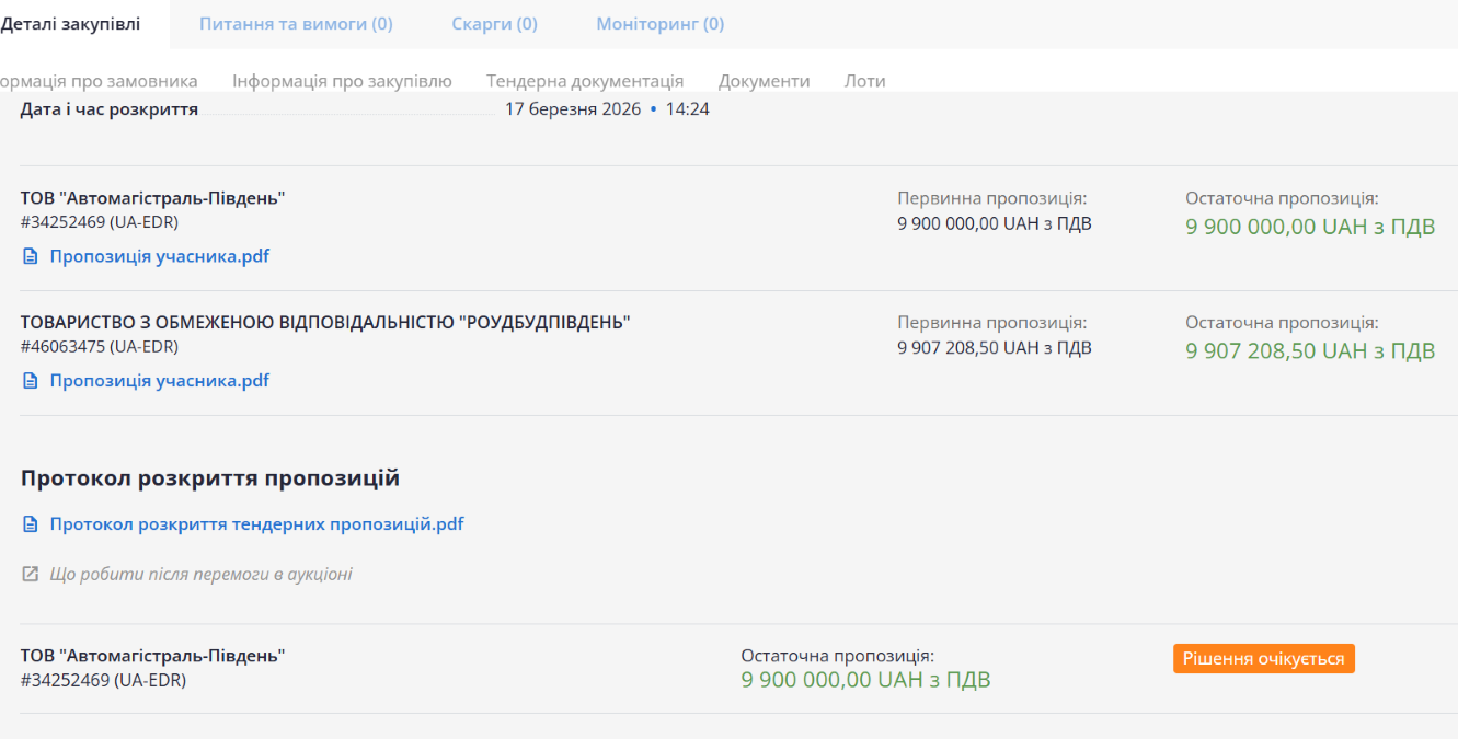 Переможцем визначили ТОВ "Автомагістраль-Південь". Станом на завершення процедури рішення про укладення договору перебуває в статусі очікування.