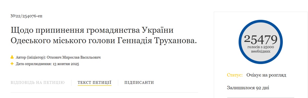 Петицію з проханням позбавити громадянства України Одеського міського голову Геннадія Труханова менш ніж за добу підписали понад 25 тисяч українців.