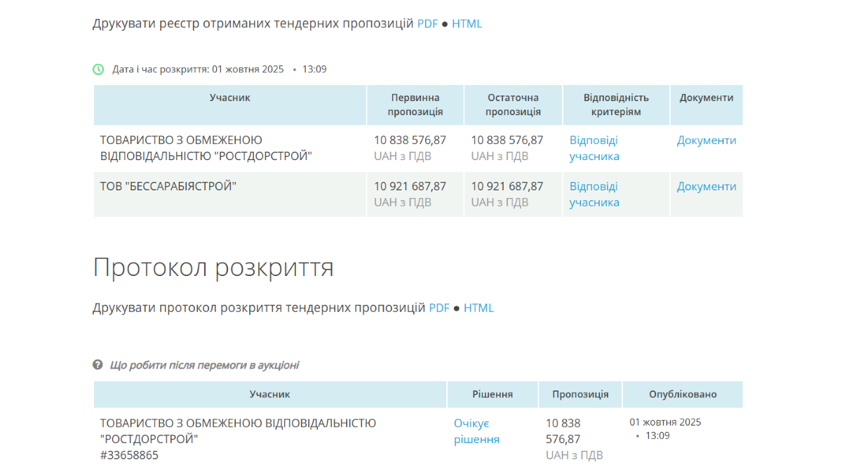 На торги вийшли дві компанії — ТОВ "Бессарабіястрой" та ТОВ "Ростдорстрой". Перемогу здобув "Ростдорстрой", запропонувавши суму майже на 90 тисяч гривень нижчу за очікувану вартість. Зараз компанія очікує рішення про укладення договору.