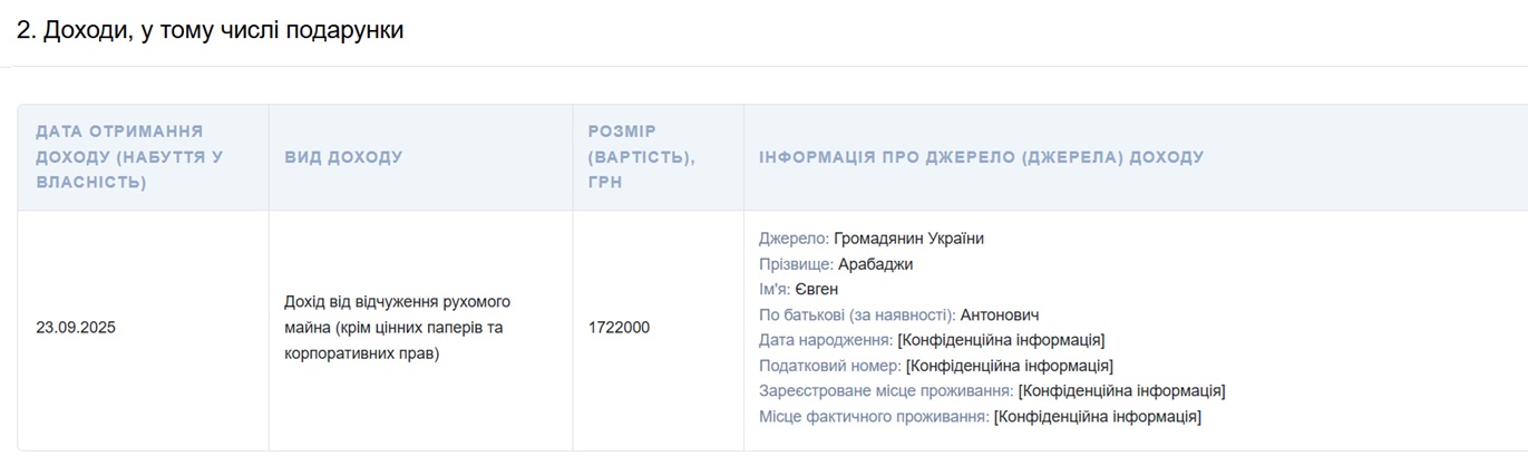 У тій же декларації суддя вказала про набуття права власності на автомобіль BMW X6 xDrive 30d M Sport/G06, який коштував 4 мільйони 645,4 тисячі гривень. Також суддя подала ще одну декларацію в якій вказала про надходження 1 мільйона 722 тисяч гривень від продажу рухомого майна.