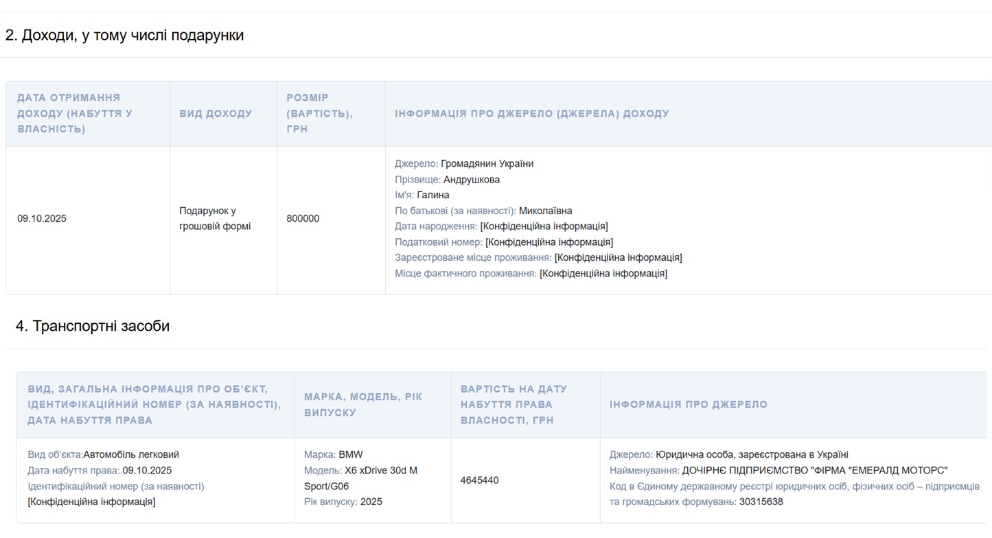 Про це зазначили у декларації судді про суттєві зміни у майновому стані, яку оприлюднило Національне агентство з питань запобігання корупції, гроші Любов Токмілова отримала від Галини Андрушкової.
