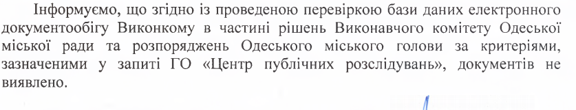 Водночас в Одеській міській раді повідомили, що у їхній системі електронного документообігу документів, які відповідали б опису запиту, не виявили. За результатами перевірки бази даних рішень виконкому та розпоряджень міського голови за зазначеними критеріями таких документів не знайдено.