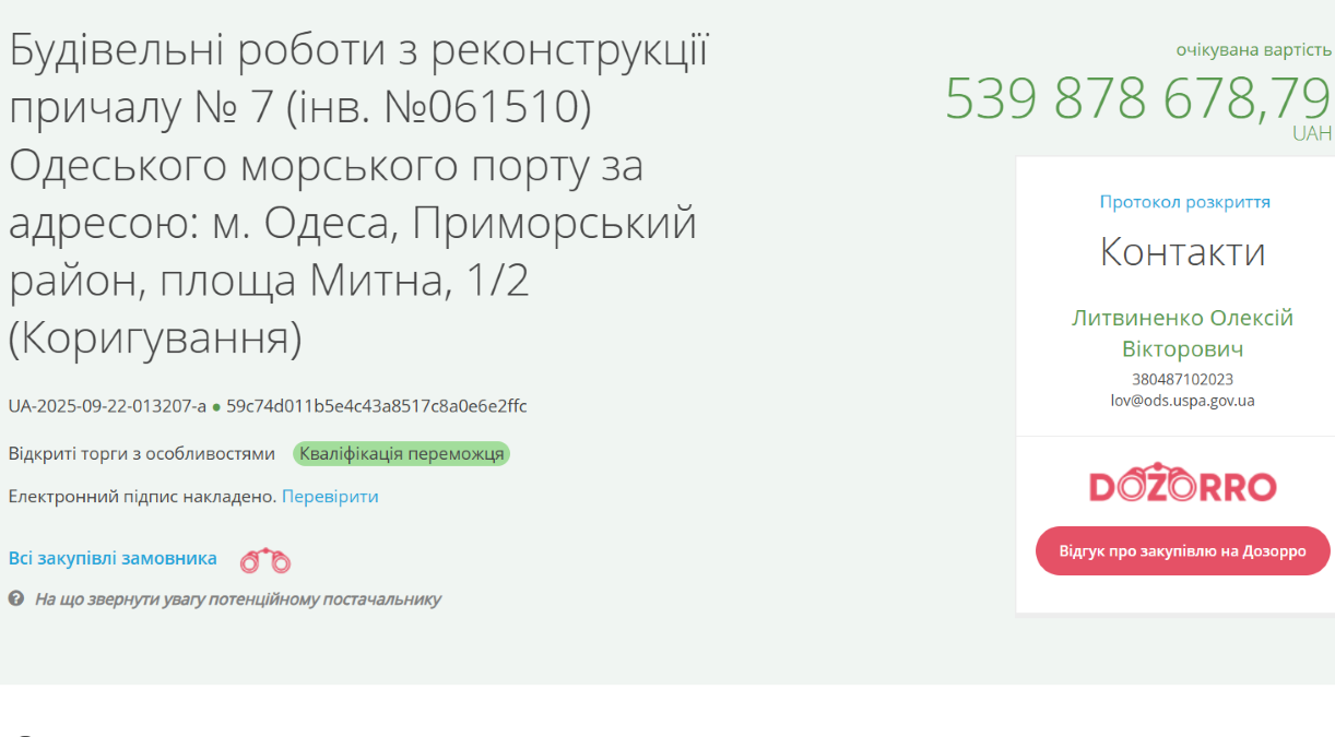 Подати пропозиції можна було до 9 вересня 2025 року, однак жодна компанія не взяла участі. В результаті торги скасували через відсутність заявок. Проте вже 30 вересня АМПУ повторно оголосила тендер на пошук підрядника. Цього разу аукціон також не відбувся, оскільки пропозицію подала лише одна компанія — ТОВ "Ремонтно-будівельний трест ЧМП". Сума, яку вона запропонувала, була лише на близько 4 мільйони гривень нижчою за очікувану вартість закупівлі.