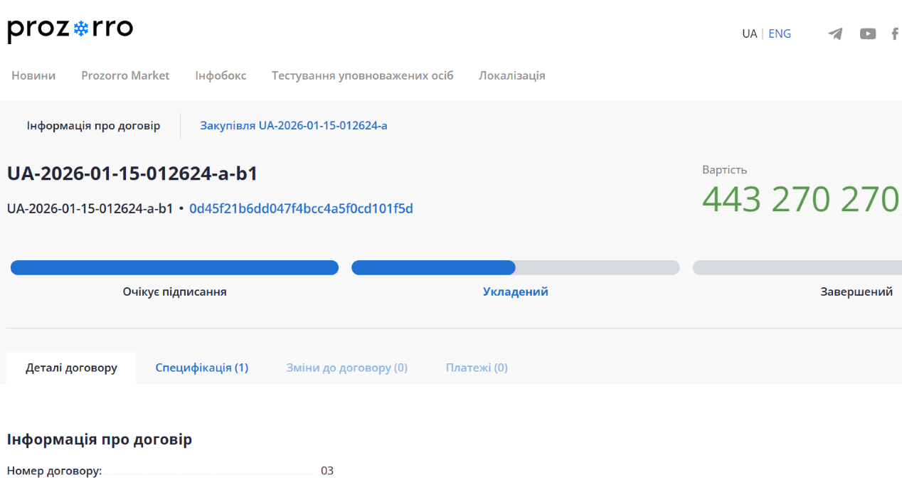Про це повідомив Центр публічних розслідувань з посиланням на систему закупівель Prozorro.